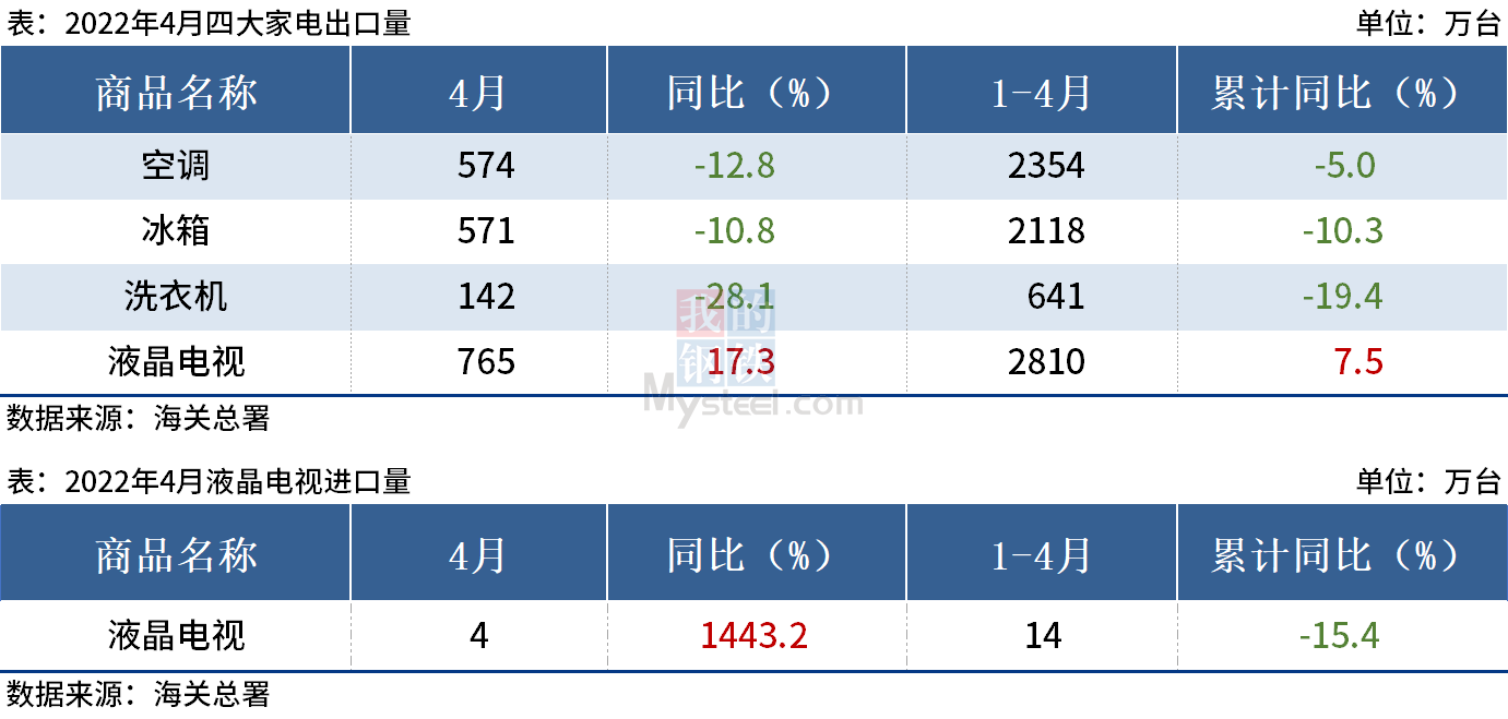 4月出口液晶電視765萬臺,同比增長17.3%;1-4月累計出口2810萬臺,同比增長7.5%;4月進口液晶電視4萬臺,同比增長1443.2%;1-4月累計進口14萬臺,同比下降15.4%。