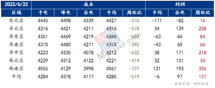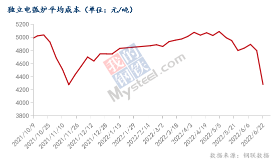 獨立電弧爐建筑鋼材鋼廠周度成本調(diào)研(2022年6月22日)(單位:元/噸)