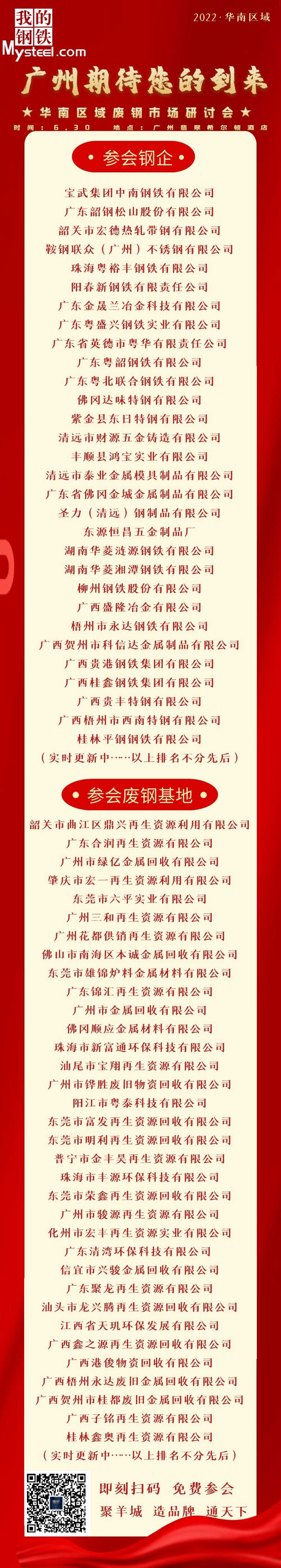 2022廢鋼全國行·華南區(qū)域廢鋼市場研討會。由上海鋼聯(lián)電子商務(wù)股份有限公司主辦、韶關(guān)市曲江區(qū)鼎興再生資源利用有限公司聯(lián)合主辦,中國廢鋼鐵應(yīng)用協(xié)會指導(dǎo),江蘇華宏科技股份有限公司、湖北力帝機床股份有限公司、江蘇大圣博環(huán)??萍脊煞萦邢薰竟餐瑓f(xié)辦,臨沂朱氏偉業(yè)再生資源設(shè)備有限公司白金贊助,江陰市宏力液壓科技有限公司黃金贊助的“2022廢鋼全國行·華南區(qū)域廢鋼市場研討會”將于2022年6月30日在廣州黃埔區(qū)翡翠希爾頓舉行,我們誠摯地邀請您出席本次會議。
