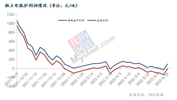 截止到6月22日,Mysteel調(diào)研全國85家獨立電弧爐鋼廠,平均開工率57.65%,周環(huán)比下降3.11%,月環(huán)比下降10.26%;產(chǎn)能利用率43.85%,周環(huán)比下降5.05%,月環(huán)比下降12.02%。本周電弧爐產(chǎn)能利用率及開工率繼續(xù)下降,產(chǎn)能利用率再創(chuàng)新低,福建、華南、西南、華中多地區(qū)均有鋼廠不同程度減產(chǎn)及停產(chǎn),導(dǎo)致電弧爐開工率及產(chǎn)能利用率繼續(xù)走低。目前電弧爐鋼廠利潤翻紅,但由于電爐廠廢鋼到貨無幾,鋼材庫存積壓,嚴峻形勢并未緩解,仍有鋼廠陸續(xù)減產(chǎn)或停產(chǎn)。