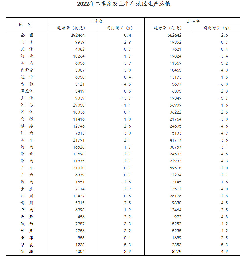 7月15日,國家統(tǒng)計局數(shù)據(jù)顯示,初步核算,上半年國內(nèi)生產(chǎn)總值562642億元,按不變價格計算,同比增長2.5%。二季度經(jīng)濟頂住壓力實現(xiàn)正增長,同比增長0.4%。同時,國家統(tǒng)計局還發(fā)布了2022年二季度及上半年地區(qū)生產(chǎn)總值。具體如下: