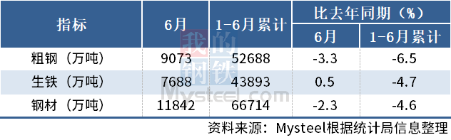 6月,中國(guó)粗鋼產(chǎn)量9073萬(wàn)噸,同比下降3.3%;生鐵產(chǎn)量7688萬(wàn)噸,同比增長(zhǎng)0.5%;鋼材產(chǎn)量11842萬(wàn)噸,同比下降2.3%。