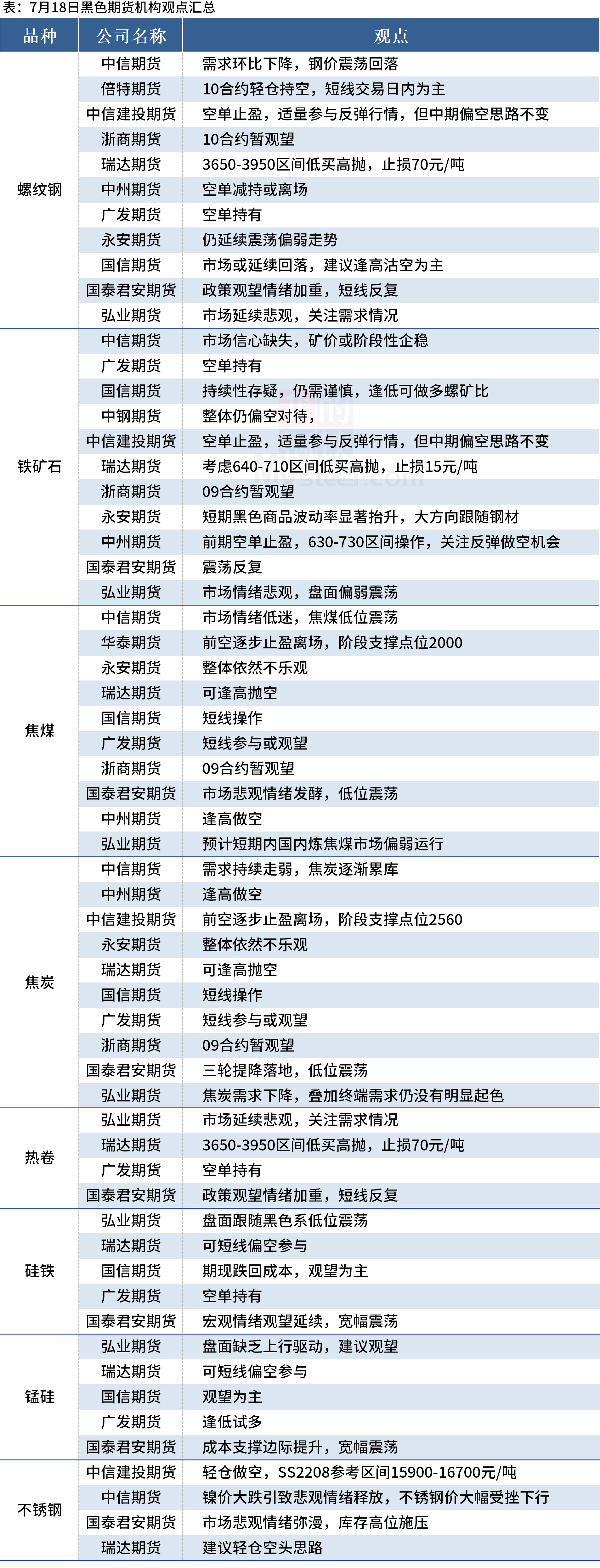 據(jù)Mysteel統(tǒng)計7月18日13家期貨機構(gòu)操作策略,其中多數(shù)機構(gòu)看空螺紋鋼,預(yù)計鐵礦石偏弱震蕩,焦煤、焦炭低位震蕩,建議暫觀望。具體匯總內(nèi)容如下: