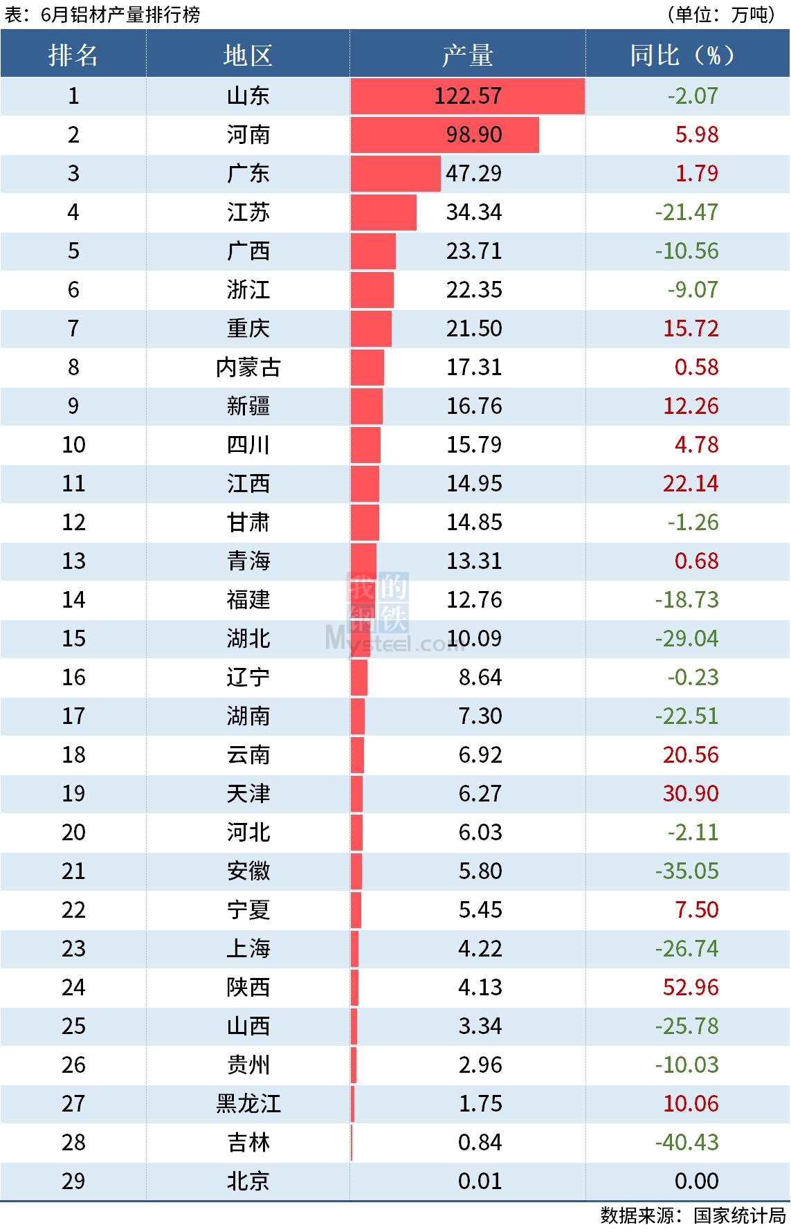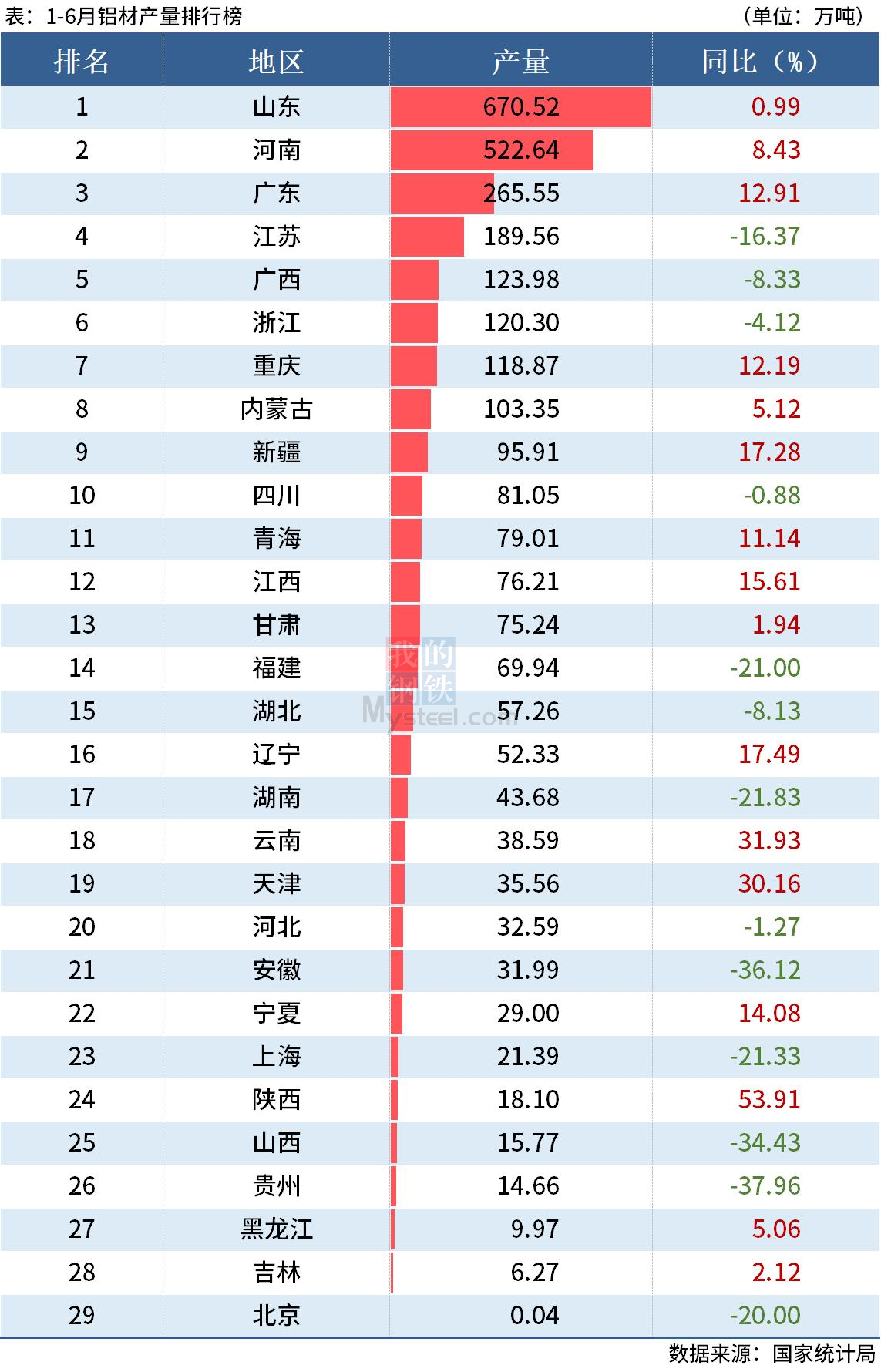 國(guó)家統(tǒng)計(jì)局?jǐn)?shù)據(jù)顯示,6月全國(guó)鋁材產(chǎn)量550.1萬(wàn)噸,同比下降6.7%;1-6月累計(jì)產(chǎn)量2999.4萬(wàn)噸,同比下降2.8%。其中,上半年山東、河南和廣東鋁材產(chǎn)量分別同比增長(zhǎng)0.99%、8.43%和12.91%。