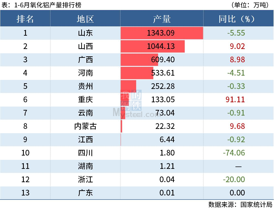 國(guó)家統(tǒng)計(jì)局?jǐn)?shù)據(jù)顯示,2022年6月全國(guó)氧化鋁產(chǎn)量731.7萬(wàn)噸,同比增長(zhǎng)7.4%;1-6月累計(jì)產(chǎn)量4020.4萬(wàn)噸,同比增長(zhǎng)2.3%。其中,上半年山東氧化鋁產(chǎn)量同比下降5.55%,山西和廣西氧化鋁產(chǎn)量分別同比增長(zhǎng)9.02%和8.98%。