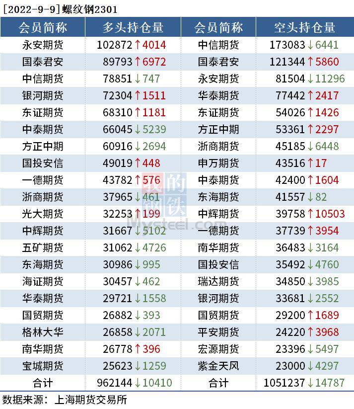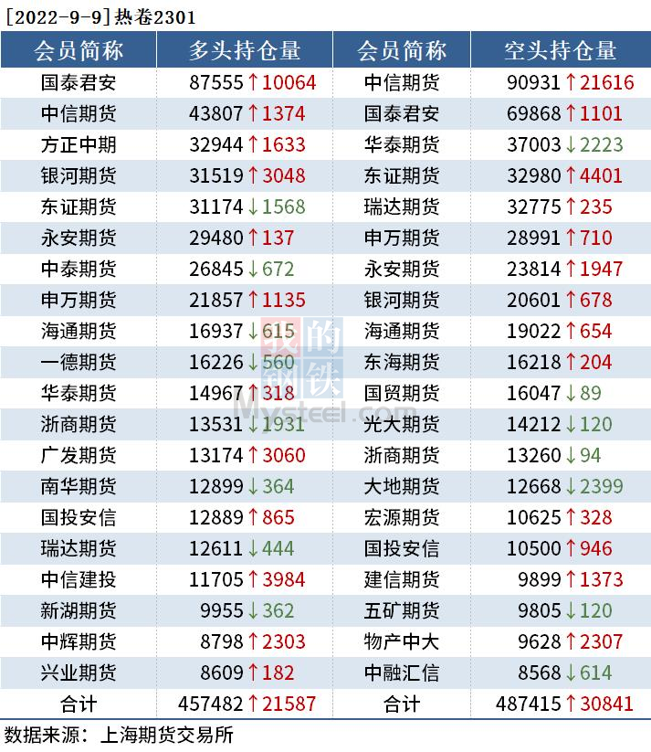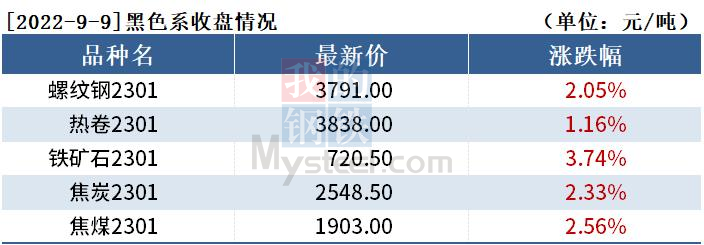 截至9月9日收盤,螺紋鋼2301收3791元/噸,漲2.05%;熱卷2301收3838元/噸,漲1.16%;鐵礦石2301收720.5元/噸,漲3.74%。