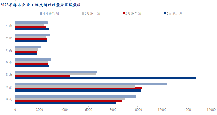 分區(qū)域上看,上周七大區(qū)域中,華北、華東工地廢鋼回收量繼續(xù)下降,而華南、華中、西南、西北、東北區(qū)域回收量整體呈增加之勢,其中以華南地區(qū)增幅最為明顯,其它區(qū)域多以小幅度增加為主。由于上周華南大區(qū)廢鋼價格先漲后降,這刺激了部分商家短時期的出貨意愿,基地反饋工地廢鋼上貨量短時期增多,但由于價格漲勢未能持久,因此收貨后基地方面又加快了出貨節(jié)奏。