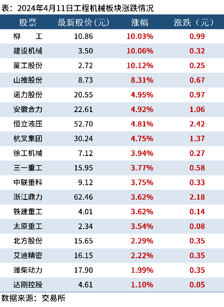 工程機(jī)械板塊集體大漲。柳工、建設(shè)機(jī)械、廈工股份漲停,其中柳工股價(jià)創(chuàng)2015年7月以來(lái)新高;山推股份漲超8%;諾力股份、安徽合力、恒立液壓、杭叉集團(tuán)漲超4%。