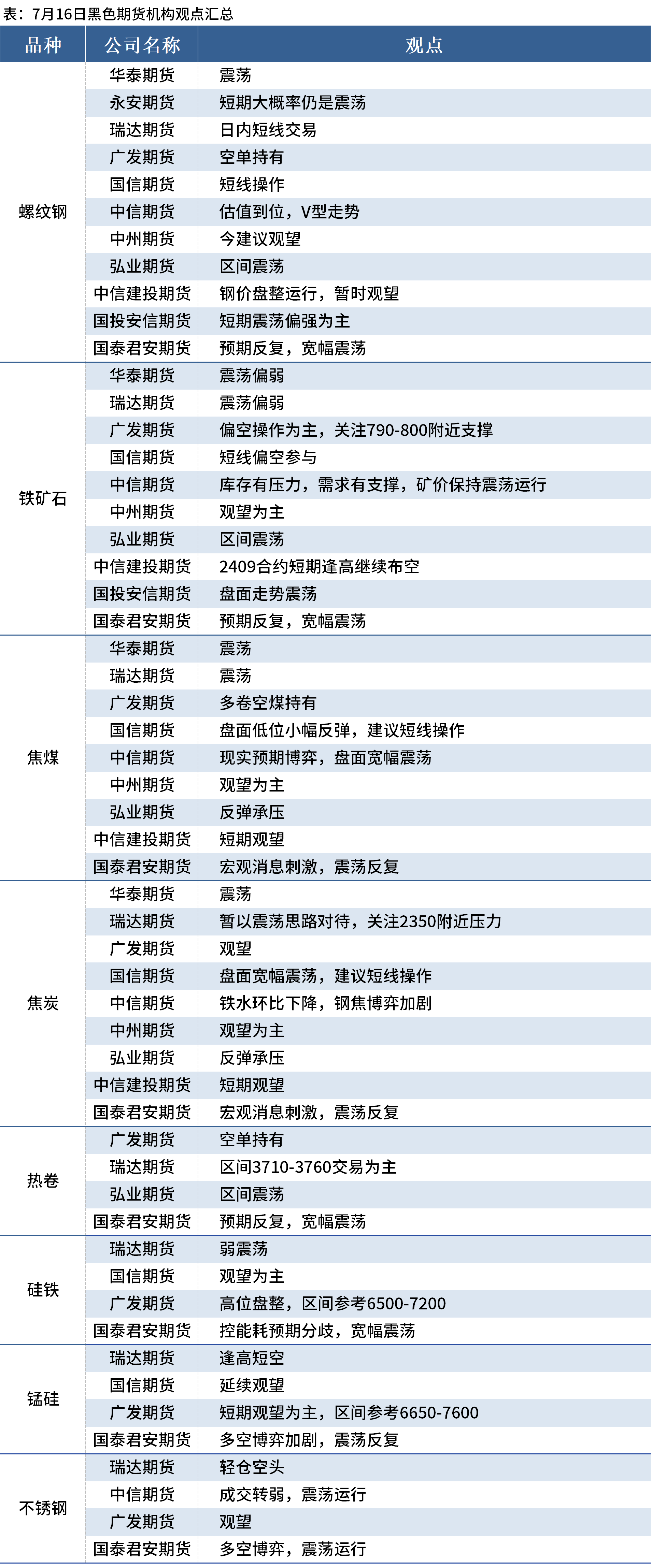 據(jù)Mysteel統(tǒng)計7月16日11家期貨機(jī)構(gòu)操作策略,其中多數(shù)機(jī)構(gòu)料螺紋鋼震蕩運行,鐵礦石震蕩偏弱,焦煤、焦炭震蕩運行。具體匯總內(nèi)容如下: