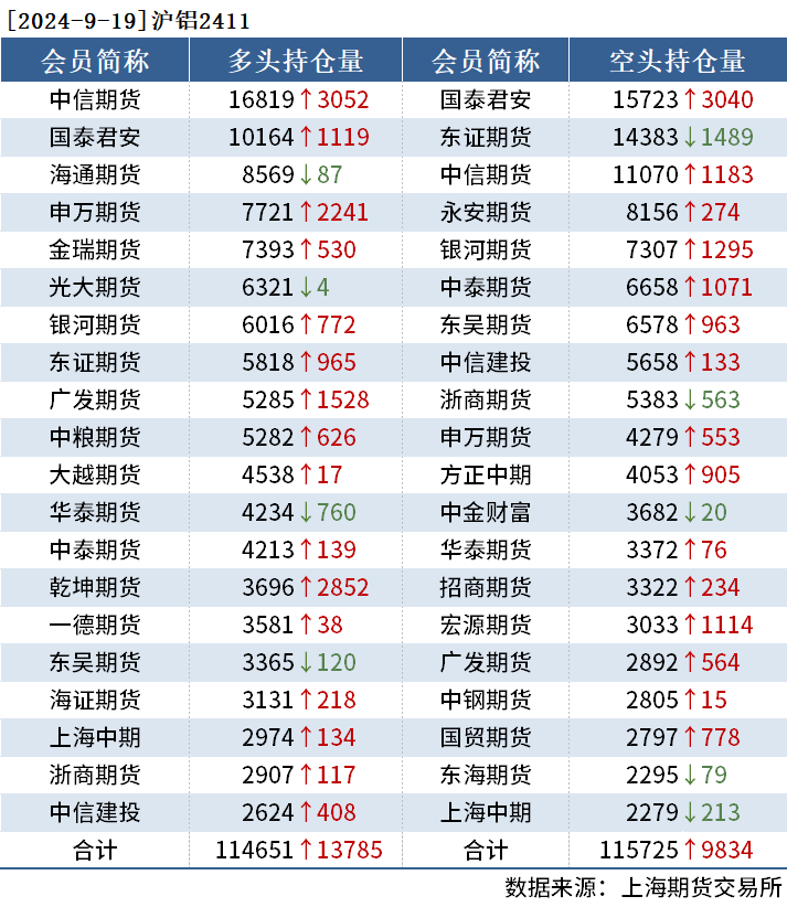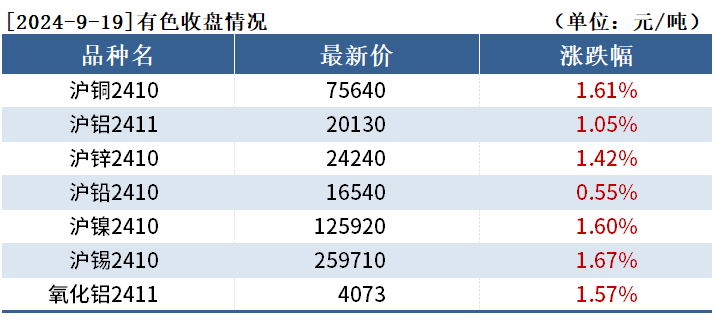 截至9月19日收盤,滬銅2410收75640元/噸,漲1.61%;滬鋁2411收20130元/噸,漲1.05%;氧化鋁2411收4073元/噸,漲1.57%。