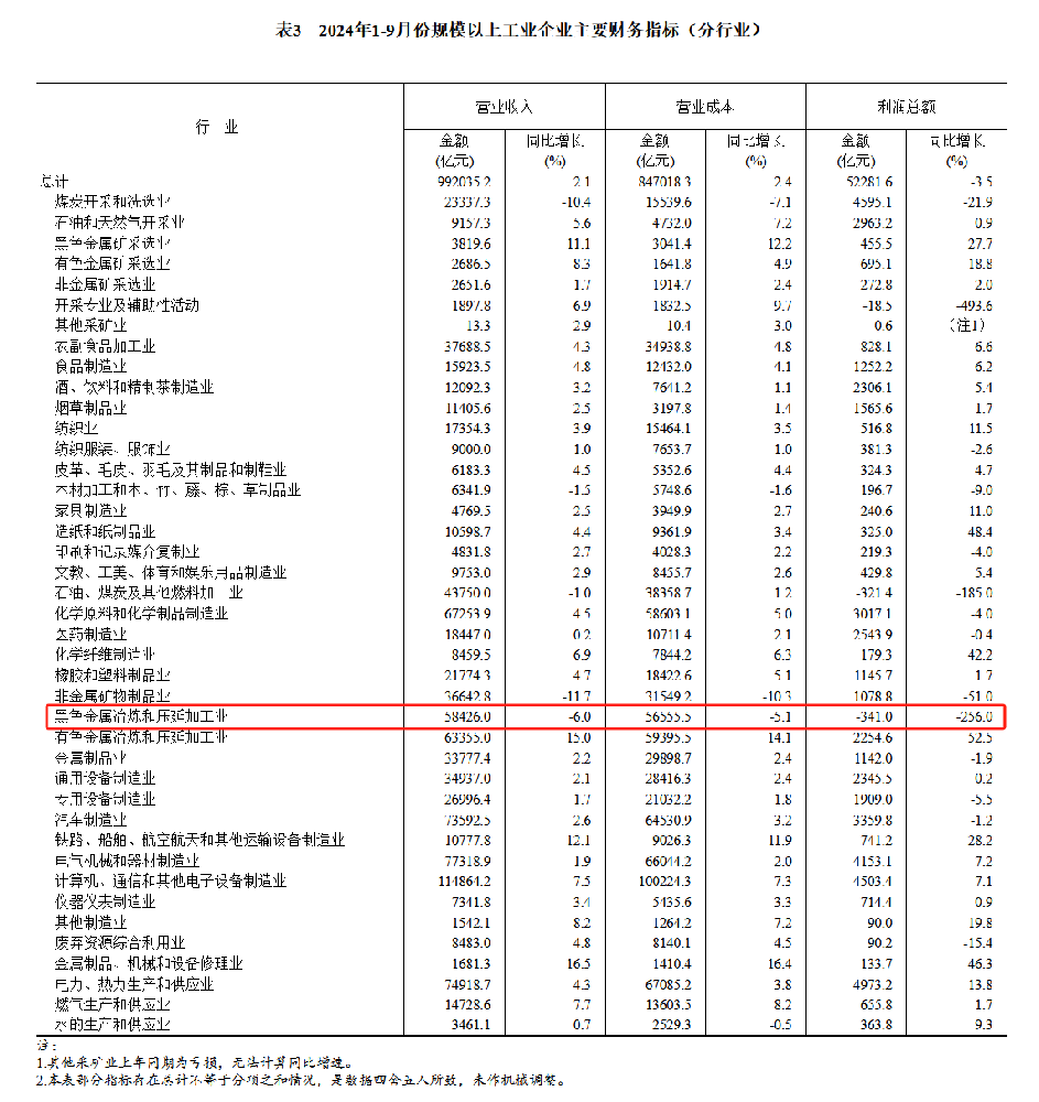 1-9月份,黑色金屬冶煉和壓延加工業(yè)利潤(rùn)總額虧損341億元。
